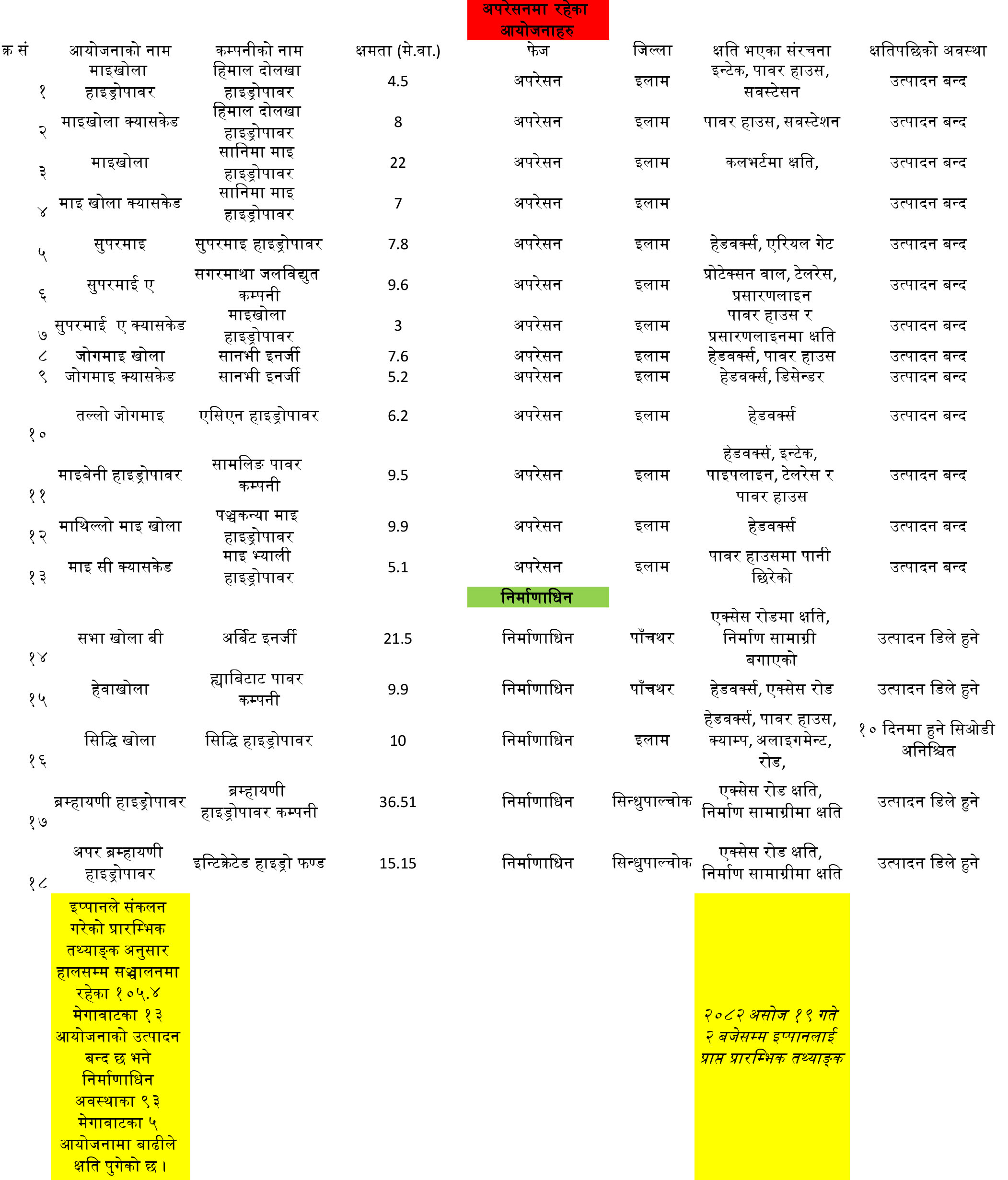 त्यस्तै, निर्माणाधीन ९३ मेगावाटकाे पाँच जलविद्युत आयोजनामा समेत क्षति पुगेको छ।याे तथ्याक इप्पानले आइतबार २ बजेसम्म सकलन गरेकाे तथ्यांक हाे।