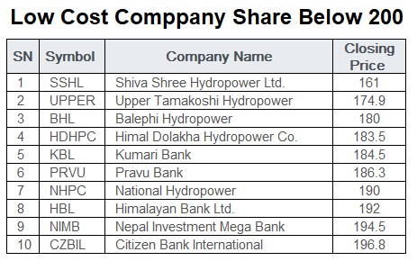 कुनै बेला न्यून मूल्य रहेका हाइ क्याप कम्पनीहरु पनि बढ्ने आशा गरेर लगानी गर्न सकिने लगानीकर्ताहरु बताउँछन् । आइतबारको अन्तिम मूल्य अनुसार बजारमा २ सय रुपैयाँ भन्दा कम मूल्यमा १० कम्पनीको शेयर कारोबार भइरहेका छन् । २ सय रुपैयाँ भन्दा कम मूल्यमा कारोबार भइरहेका कम्पनीहरु हाइड्रोपावर र वाणिज्य समूहका छन् । तथ्यांक अनुसार ५ वटा वाणिज्य समूहका र ५ वटा हाइड्रोपावर समूहका शेयर मूल्य २ सय मुनि कारोबार भइरहेका छन् । हाइड्रोपावर समूहबाट शिवश्री हाइड्रोपावर, अप्पर तामाकोशी हाइड्रोपावर, बलेफी हाइड्रोपावर, हिमाल दोखरा हाइड्रोपावर र नेसनल हाइड्रोपावरको शेयर मूल्य २ सय मुनि कारोबार भइरहेको छ भने वाणिज्य बैंक समूहतर्फ कुमारी बैंक, प्रभु बैंक, हिमालयन बैंक, नेपाल इन्भेष्टमेन्ट मेगा बैंक, सिटिजन्स इन्टरनेसनल बैंकको शेयर मूल्य २ सय रुपैयाँ भन्दा कम मूल्यमा कारोबार भइरहेको छ ।