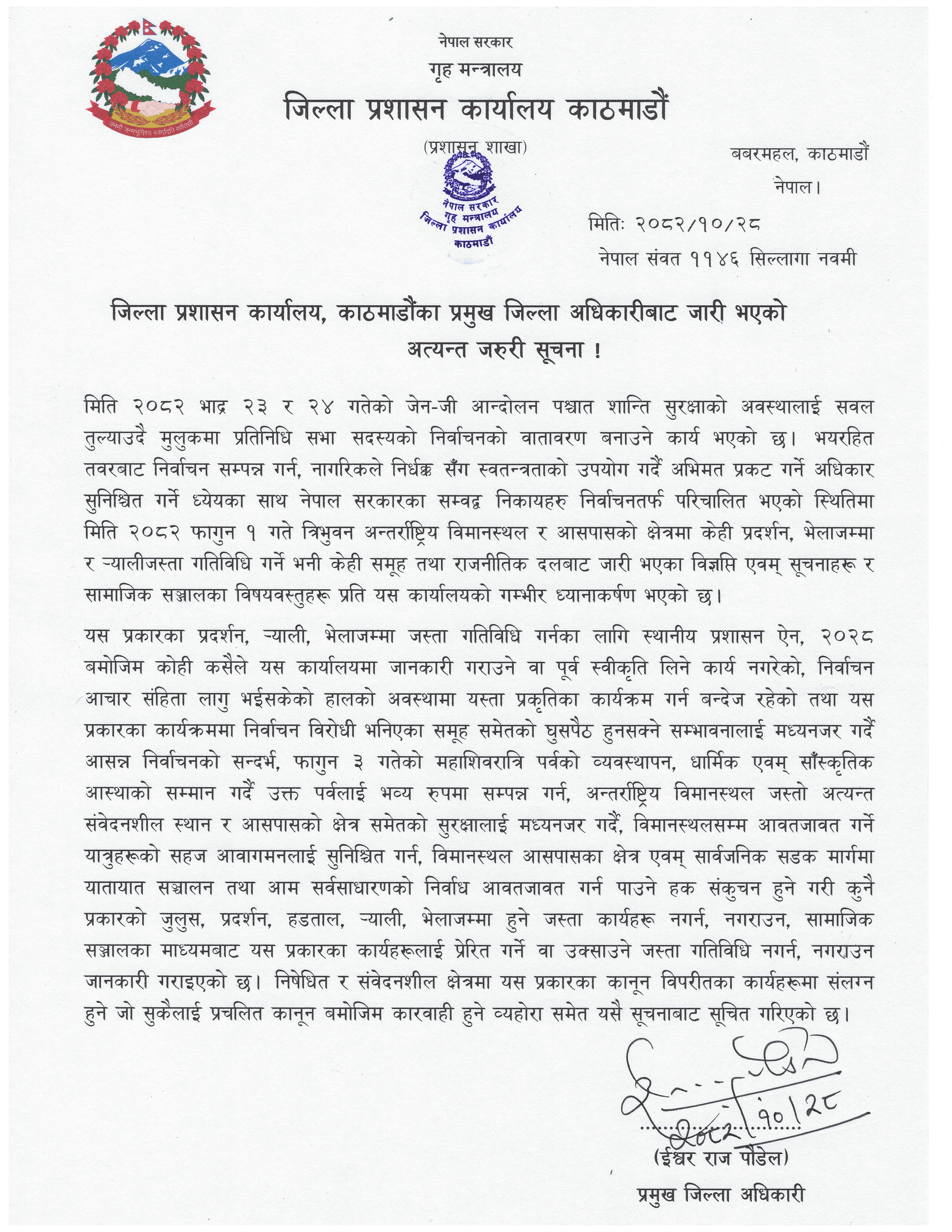 यद्यपि, निषेध आदेश जारी गरिएका क्षेत्र बाहेकका स्थानमा संविधान प्रदत्त विचार तथा अभिव्यक्तिको स्वतन्त्रता र शान्तिपूर्ण भेला हुने अधिकारप्रति प्रशासन प्रतिबद्ध रहेको स्पष्ट पारिएको छ।