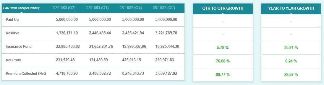 चालु आवको दोस्रो त्रैमाससम्म कम्पनीले २३ करोड १५ लाख रुपैयाँ खुद मुनाफा कमाएको छ भने कम्पनीको व्यापारमा राम्रो सुधार देखिएको छ । चालु आवको दोस्रो त्रैमाससम्म कम्पनीले ४ अर्ब १४ करोड रुपैयाँ भन्दा बढी बीमा शुल्क उठाएको छ जुन अघिल्लो आवको तुलनामा साढे २२ प्रतिशतले बढी हो ।