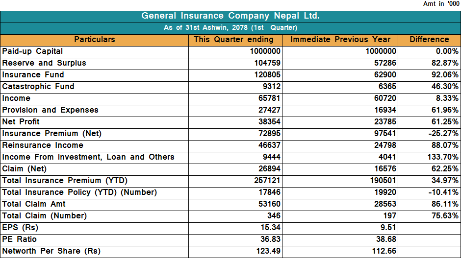 चुक्ता पूँजी एक अर्ब रुपैयाँ रहेको यस कम्पनीको जगेडा कोषमा १० करोड ४७ लाख रुपैयाँ, बीमा कोषमा १२ करोड ८ लाख रुपैयाँ र महाविपत्ती कोषमा ९३ लाख रुपैयाँ सञ्चित छ।