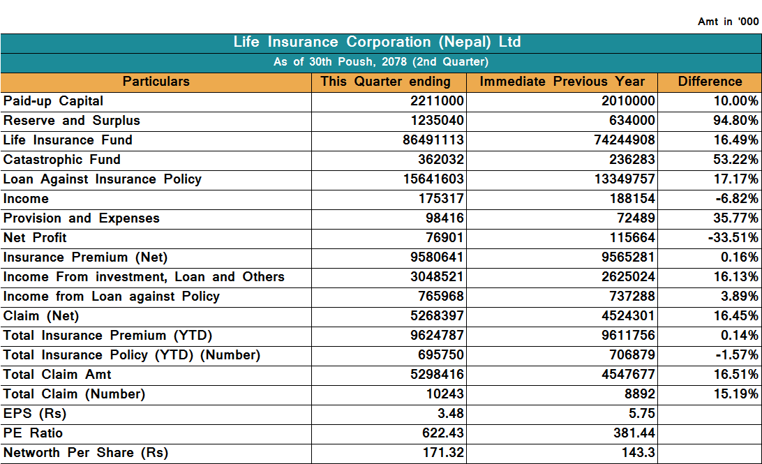 बीमांकिय मूल्यांकन अघि इन्स्योरेन्सको खुद नाफा भने ३३.५१ प्रतिशतले घटेर ७ करोड ६९ लाख रुपैयाँमा सीमित भएको छ। गत आर्थिक वर्षको यहि अवधिमा कम्पनीले ११ करोड ५६ लाख रुपैयाँ खुद नाफा कमाएको थियो।