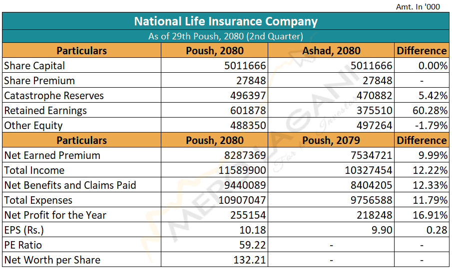 नाफासँगै इन्स्योरेन्सको प्रतिशेयर आम्दानी पनि सामान्य बढेको छ। समीक्षा अवधिमा इन्स्योरेन्सको यस्तो आम्दानी २८ पैसा बढेर १० रुपैयाँ १८ पैसा पुगेको छ। सो अवधिसम्ममा इन्स्योरेन्सको मूल्य आम्दानी अनुपात ५९.२२ गुणा रहेको छ भने प्रतिशेयर नेटवर्थ १३२ रुपैयाँ २१ पैसा रहेको छ।